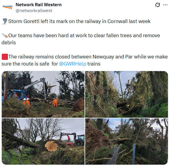 Storm Goretti brought strong winds to South West England overnight Thursday into Friday, bringing down trees and causing power supply issues that affected the signalling system between Par and Newquay.