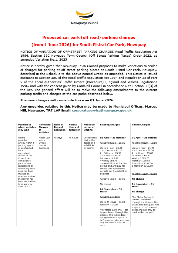 The proposals are set out in a Notice of Variation issued under Section 35C of the Road Traffic Regulation Act 1984, with the consent of Cornwall Council. They form part of the Newquay Town Council (Off Street Parking Places) Order 2022, as amended.